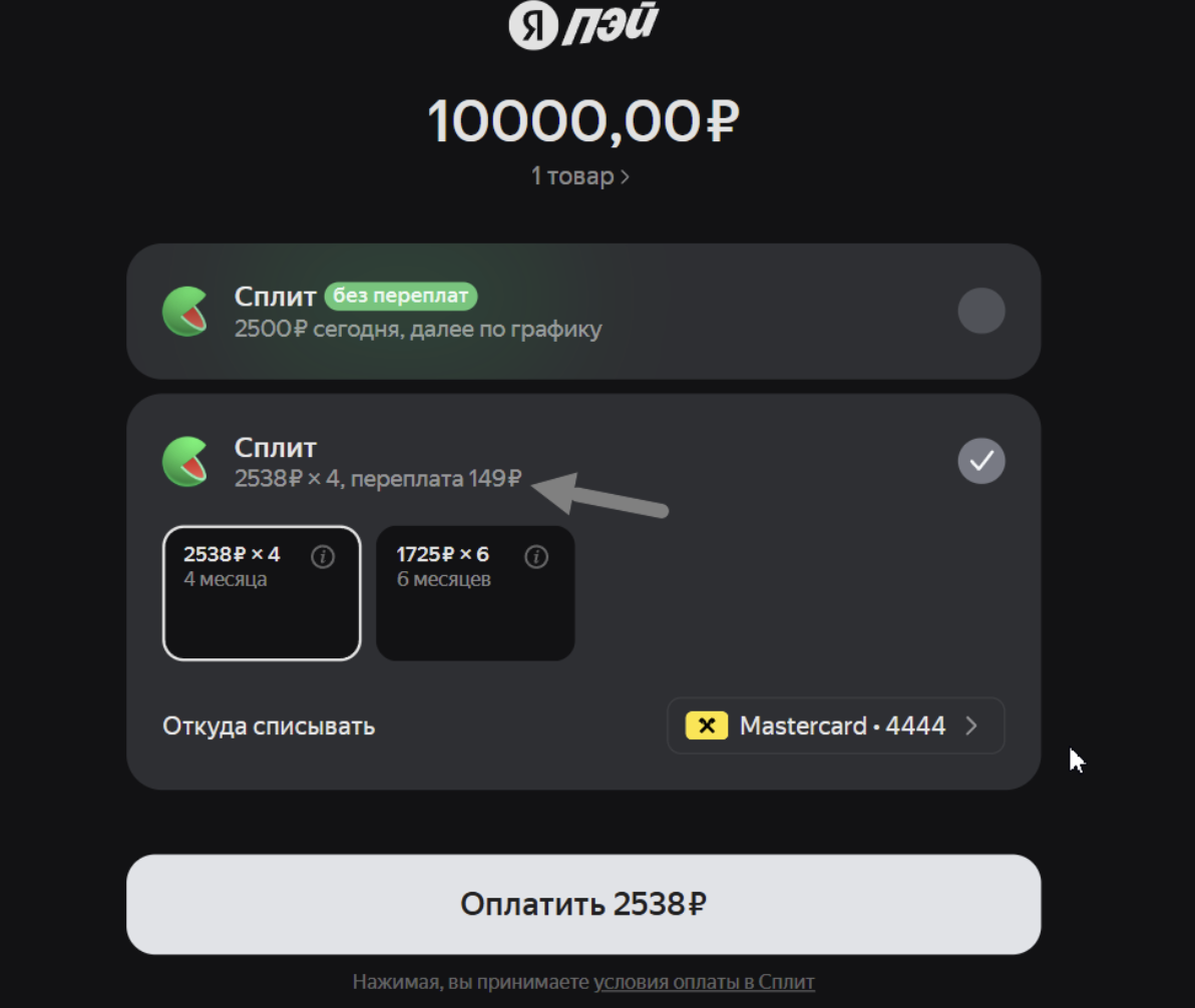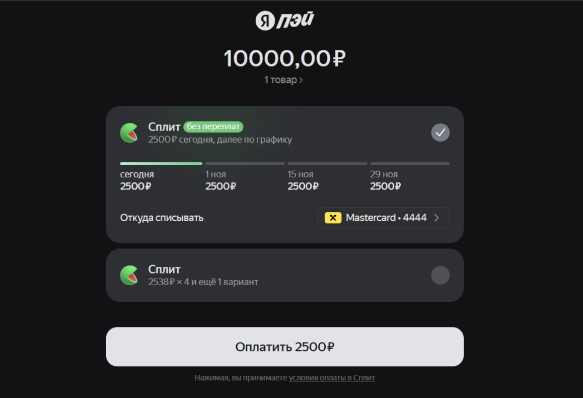 После выбора оплаты через Яндекс Сплит покупатель попадает на страницу с выбором графика платежей от сервиса.
