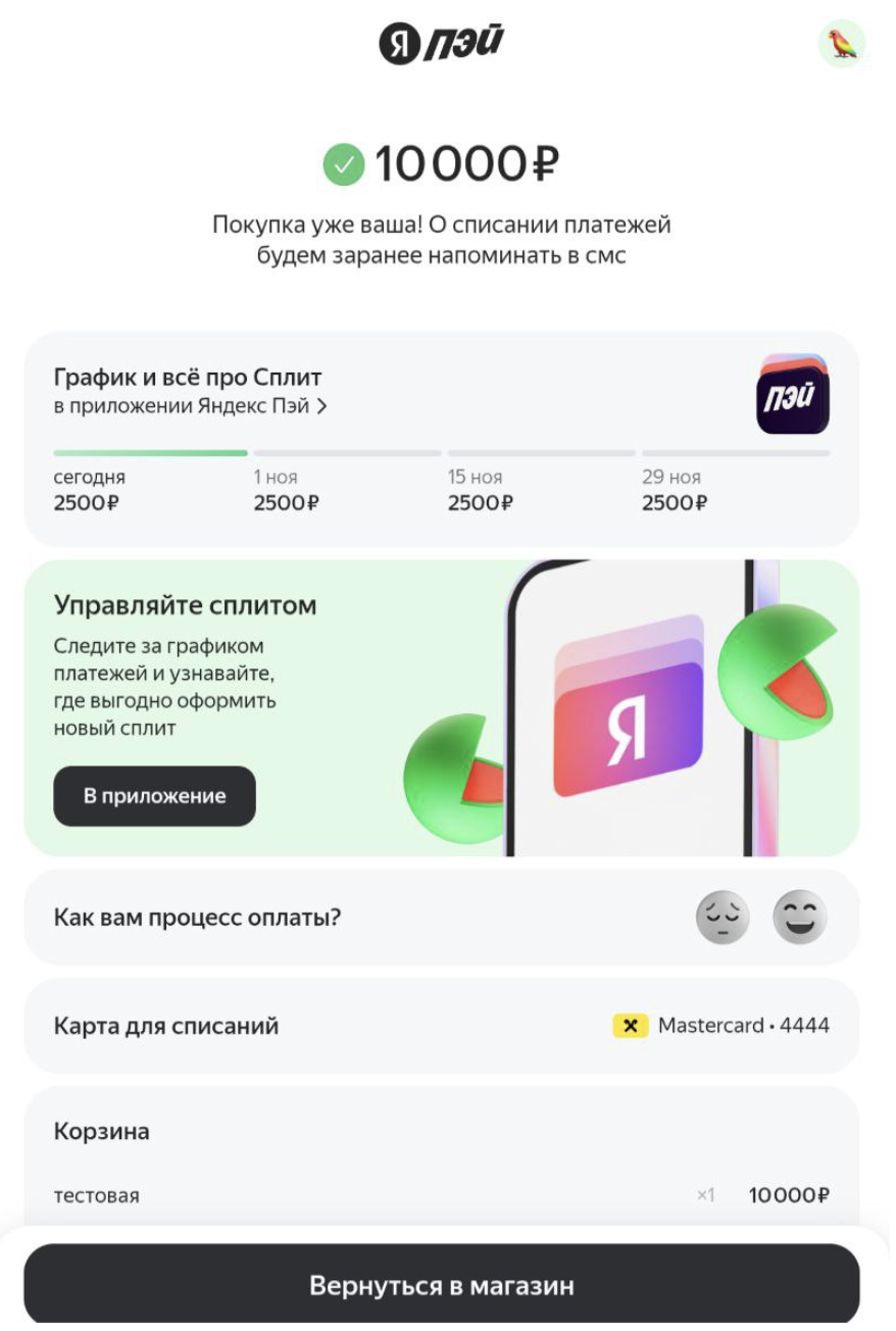 После успешной оплаты появится сообщение об удачном платеже. График платежей покупатель может отслеживать в приложении Яндекс Пэй. О предстоящем списании покупателю будет направлено смс.