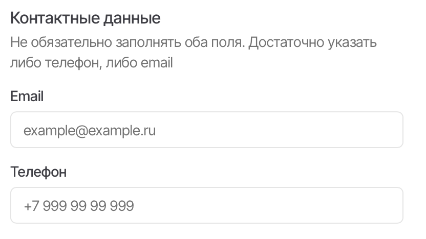 В этом пункте нужно указать email и/или телефон покупателя. Обязательным для заполнения является либо поле «Email», либо поле «Телефон».