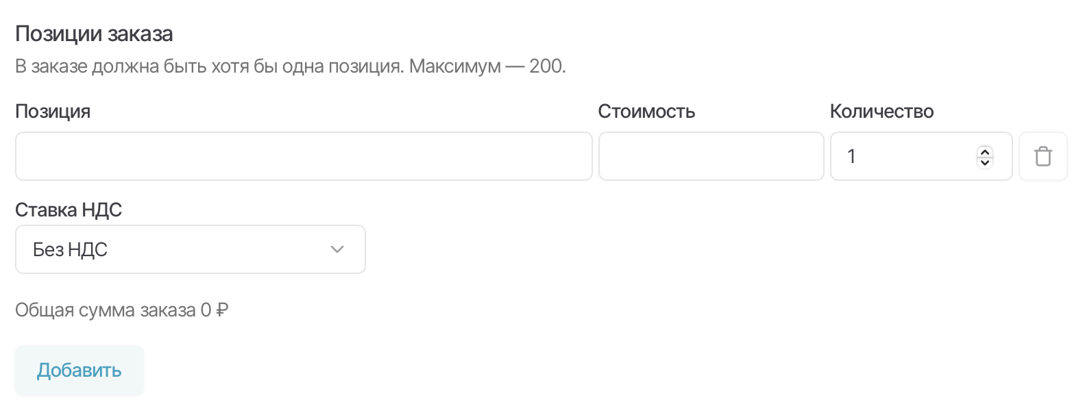 В этом пункте необходимо добавить позиции, которые будут доступны для покупки. Для каждой позиции нужно указать наименование, стоимость и количество. Также можно назначить ставку НДС для каждой позиции отдельно. По умолчанию в заказе выбрана ставка, установленная для компании.