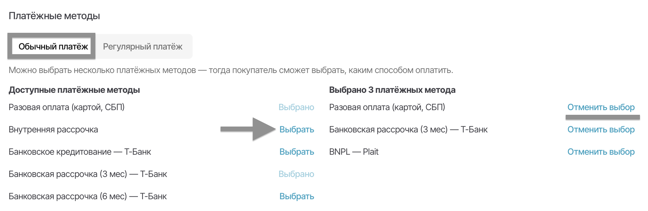 Опция «Обычный платеж» позволяет добавить один или несколько платёжных методов в качестве приема оплат (разовый платеж, внутренняя рассрочка, банковская рассрочка, кредитование, оплата частями). В этом случае у покупателя будет возможность выбрать способ оплаты.