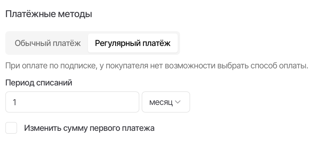 Для настройки первого платежа необходимо включить опцию «Изменить сумму первого платежа» и указать стоимость. Таким образом, первая оплата по подписке будет произведена покупателем согласно заданному платежу, а последующие списания будут проходить по основной стоимости.