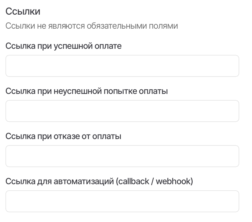 В этом пункте можно добавить ссылки, куда будет перенаправлен покупатель при оплате. Заполнение данных полей не является обязательным действием при создании заказа. Если поля оставить пустыми, то покупатель останется на платежной странице.
