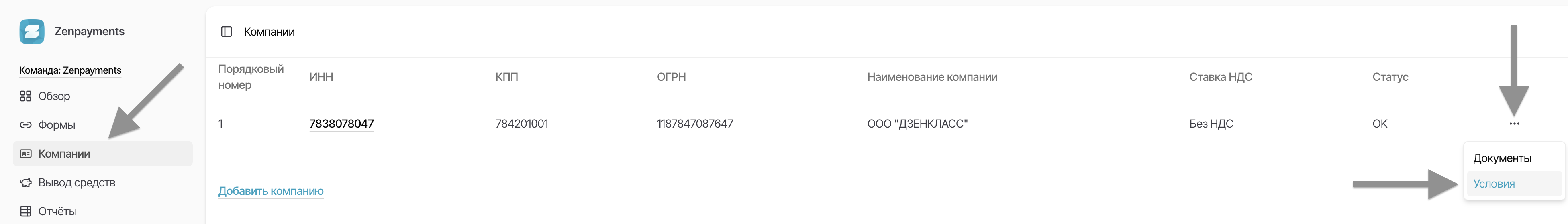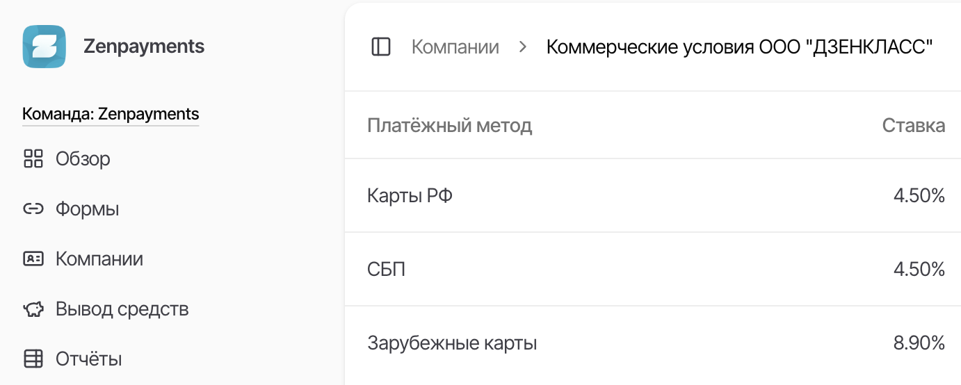 Для просмотра комиссии по всем платежным методам необходимо перейти в раздел «Компании», нажать на три точки рядом с нужной компаний и выбрать в меню «Условия».