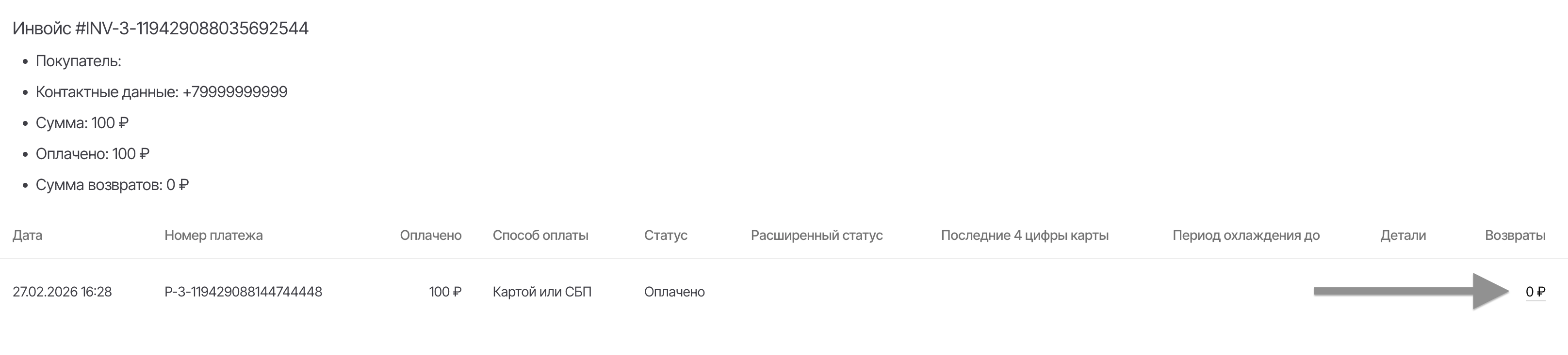 После этого откроется детальная информация по платежу. На данной странице необходимо нажать на цифру в столбце «Возвраты».