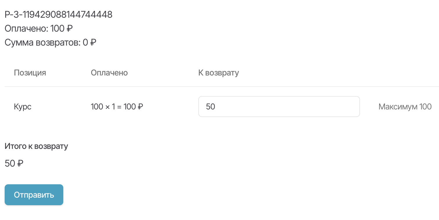 На следующем шаге в столбце необходимо указать сумму, которая будет возвращена покупателю и нажать кнопку «Отправить».
